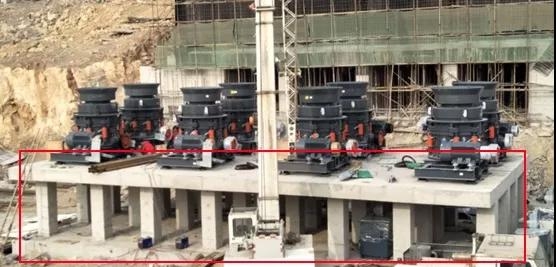 1)设备放置于构建的基础上(圆锥破必须安装在稳固的钢筋混凝土基础上,且为了避免矿石堆积,基础下部必须有足够的空间,安装运输设备)。