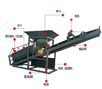 滚筒筛沙机主要由、机架、料斗、减速器、电动机、输送带等组成。它是仿照人工利用斜面筛网筛砂的工作原理,石料经料斗进入滚筒后,一方面随着滚筒转动而被筛选,一方面粒度大的石料沿着滚筒的斜度向前流动,通过不同网目的的筛网逐渐被筛出。