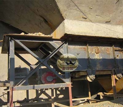 该机主要由以下几个主要部件组成,电动机、减速机、联轴器、偏心机构、漏板、槽架、滚轮等。该种设备一般安装在料仓出料口下部,矿石落入槽体底部的漏板上,底部漏板设置在滚轮上,并通过偏心机构使漏板与双出轴的减速机相连接,然后通过联轴器与电动机相接。工作时,由电动机通过联轴器带动减速机,并通过偏心盘与设备在槽架底部和滚轮之间的漏盘一起做往复直线运动,从而完成均匀给料。