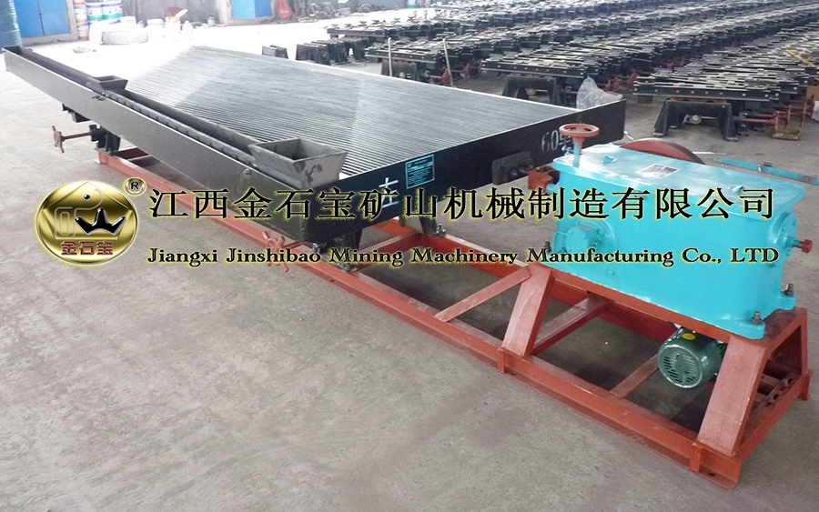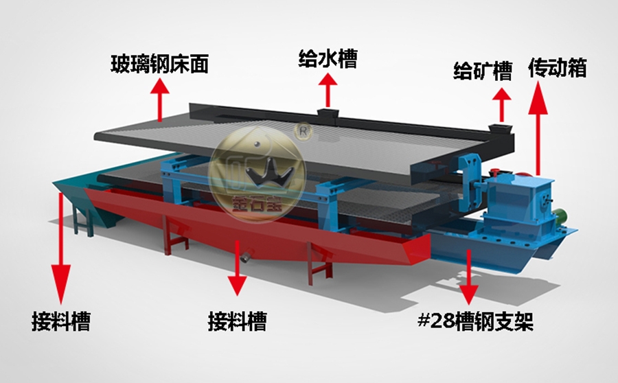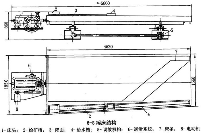 传动机构(含床头、电机);2、给矿槽;3、床面;4、给水槽;5、调坡机构(鞍型基座);五大部分组成。